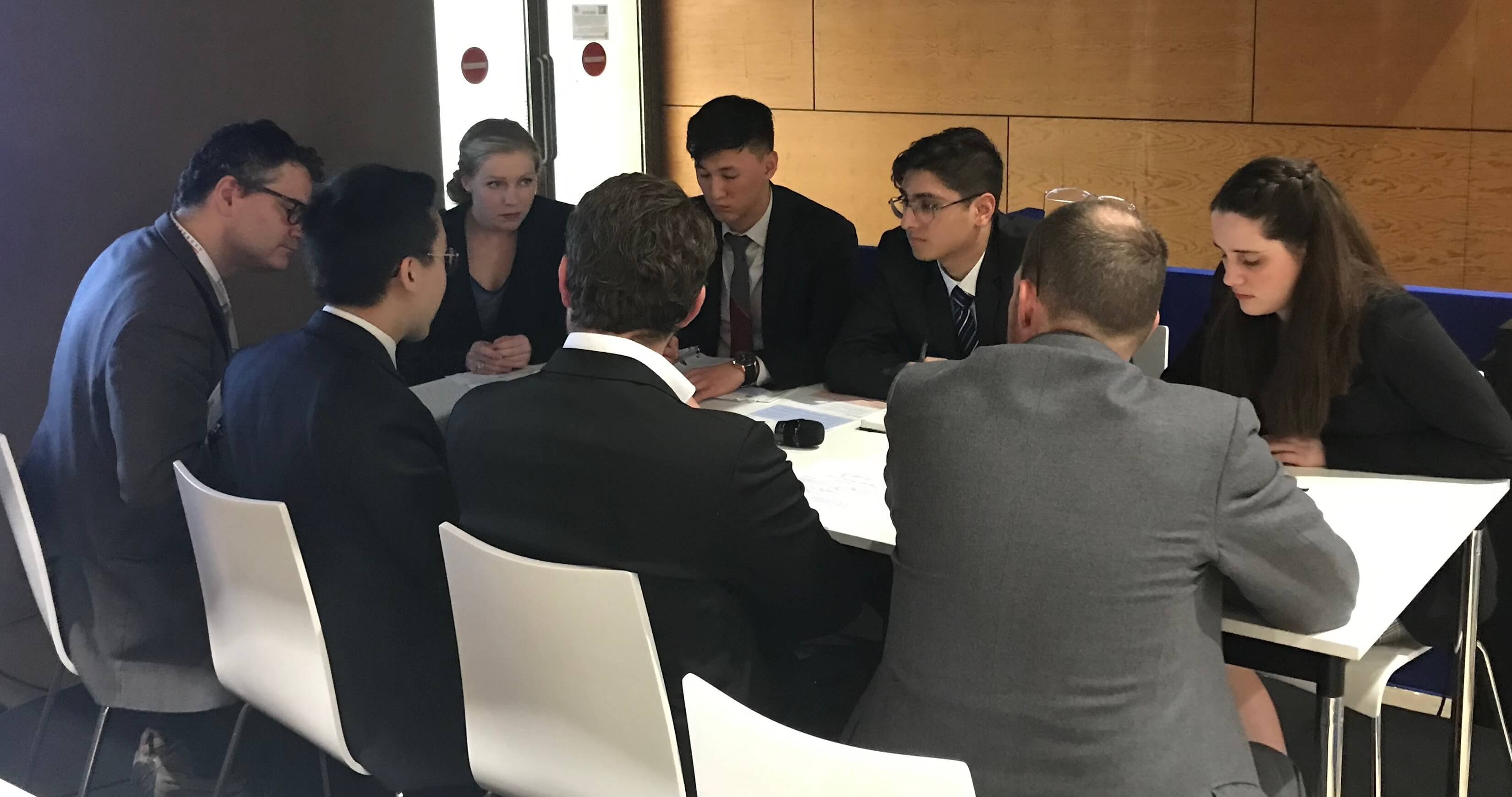 Foto: Debriefing eines der Teams. Co-Juror Jean-Christophe Ribola (PwC, Paris)